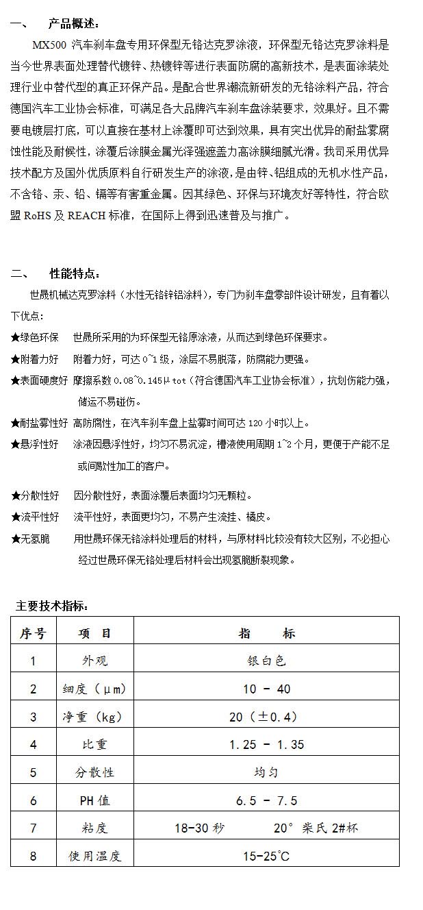 產品名稱:MX500汽車剎車盤專用環保型無鉻達克羅涂液