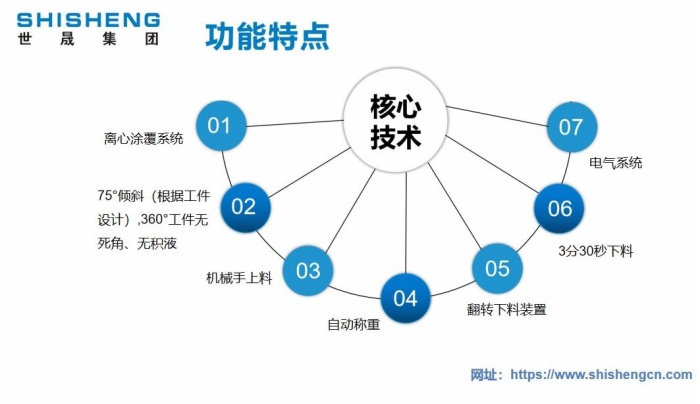 世晟集團800系列全自動達克羅涂覆生產線的設計和制造,是基于使用各種有鉻、無鉻達克羅涂料(水劑和油劑)對金屬工件進行表面涂覆工作,也可用于其它非鋅鋁涂料的零件表面涂覆、著色或封閉加工。全自動浸甩一體機由浸槽(SUS304)、甩干機構(可傾斜)、槽體、槽蓋、涂液攪拌裝置、涂液回收裝置、涂液溫度調節系統、工件回轉輸送系統(升降采用氣缸)、涂液攪拌控制系統和料筐、小車翻轉上料裝置、伸縮式網帶輸送機、稱重系統。