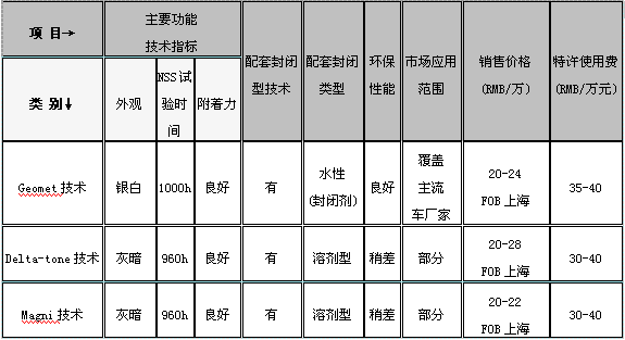 對Geomet系列、Delta-Tone系列、Magni系列三項無鉻技術進行比較,Geomet無鉻涂料底涂、面涂均為水性涂料,且Geoemt技術得到國際幾乎所有主流汽車廠家的認可,而Delta-Tone系列和Magni系列底涂為水性涂料,但面涂仍為有機溶劑型涂料,只是僅被部分廠商認可。